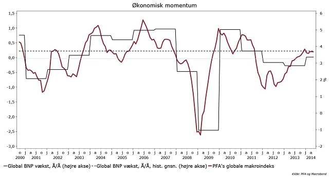 I andet halvår forventes der et vækstcomeback. Verdensøkonomien har i det store hele lagt de midlertidige vækstdæmpere bag sig, mens mange af de positive faktorer såsom lempelig pengepolitik fortsat er i spil. Men global vækst får svært ved at nå op over det historiske gennemsnit i 2014. Førnævnte strukturelle faktorer dæmper fortsat vækstpotentialet. Samtidig er opsvinget stadig i højere grad en historie om færre modvinde end om nye vækstdrivere, der melder sig på banen. Det medfører, at vores forventning om et robust, men afdæmpet globalt opsving indtil videre ser ud til at holde. Det burde ligeledes forhindre pengepolitiske fodfejl i form af forhastede stramninger.