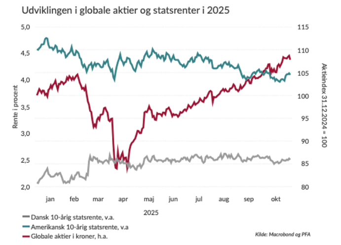 I oktober leverede både aktier og obligationer positive afkast, da aktiekurserne steg, og renterne faldt. Det globale aktieindeks steg med 3,9 procent i oktober, omregnet til danske kroner, drevet af de store amerikanske tech-aktier og en styrket dollar. Siden årets start har globale aktier leveret et afkast på 8,3 procent, når man tager højde for den markante dollarsvækkelse i første halvår. Den positive udvikling på finansmarkederne har resulteret i øgede afkast på tværs af alle vores investeringsprofiler.