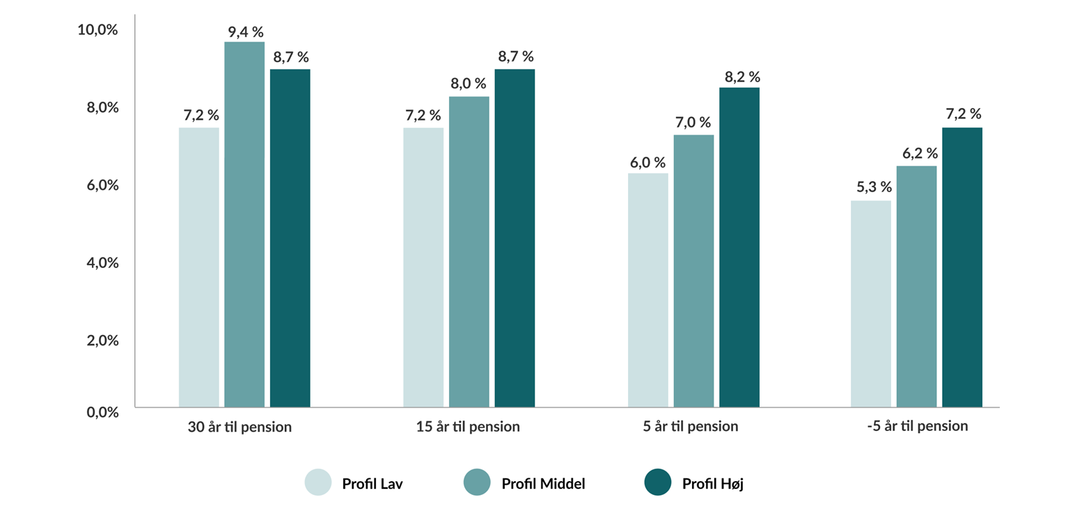 Afkastet i PFA’s investeringsprofiler er sat sammen af afkastet fra vores høj- og lavrisikofond, som også findes i en PFA Klima Plus-variation. Jo større risiko, man har i sin investeringsprofil, jo mere af opsparingen er placeret i højrisikofonden – og omvendt.
