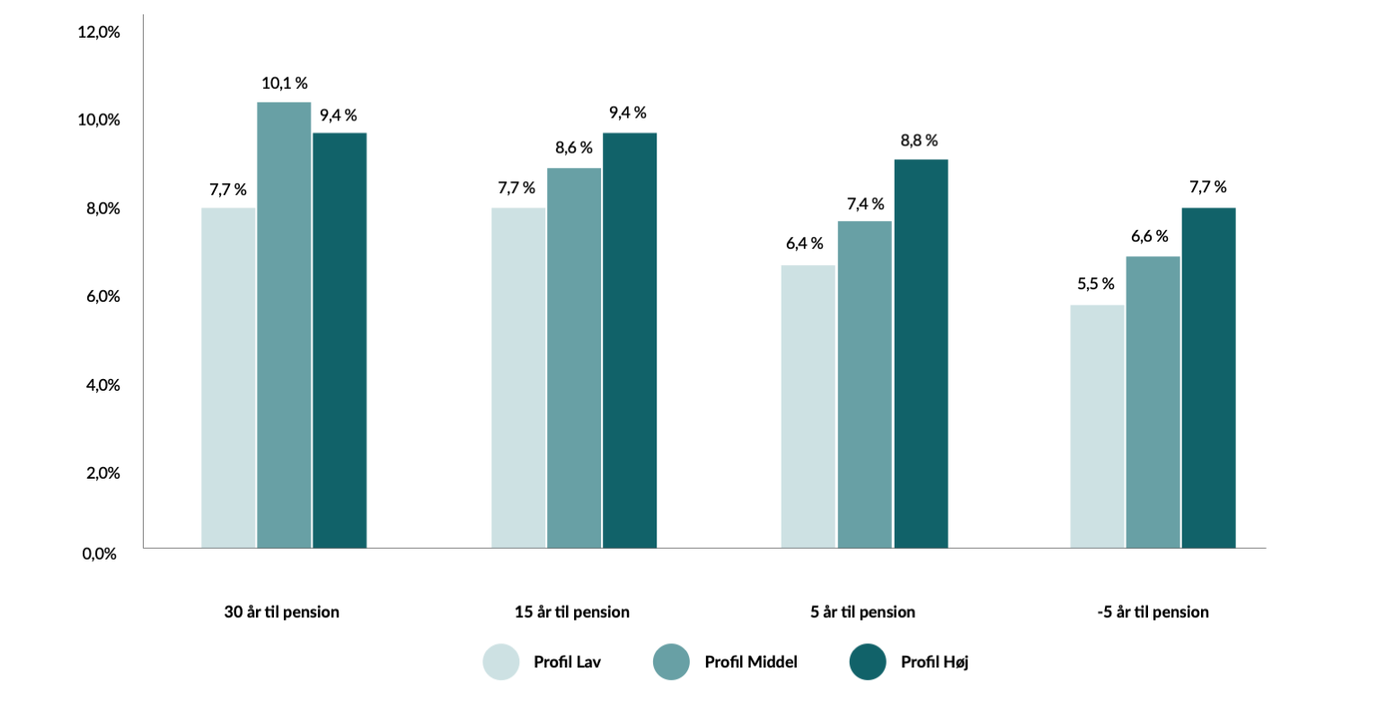 Aktieinvesteringerne i Klima Plus har klaret sig en smule bedre end i PFA Plus, da der ikke er lige så mange danske aktier. Til gengæld trækker de unoterede investeringer i private equity og infrastruktur ned i Klima Plus, hvorfor afkastet i profilerne Middel og Høj er en smule lavere end i PFA Plus.