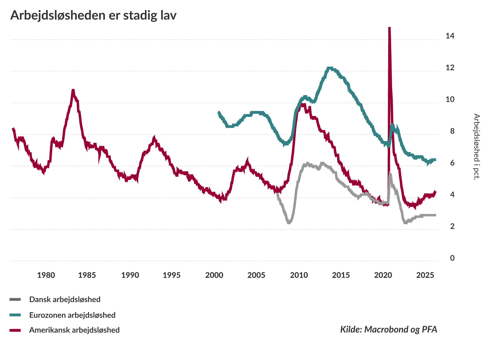 I USA er arbejdsløsheden steget til 4,4 procent og selvom det stadig er lavt i et historisk perspektiv, viser data, at nye ledige har sværere ved at finde nyt arbejde. Det skaber usikkerhed og kan føre til, at flere holder igen med forbruget. Det øger risikoen for en negativ spiral, hvor lavere forbrug fører til fyringer, som igen bidrager til stigende usikkerhed. Netop derfor forventes det også, at den amerikanske centralbank vil sænke renten yderligere for at stimulere væksten og jobskabelsen. Bankens handlefrihed er dog begrænset af, at inflationen pt. ligger på 3 procent samtidig med, at sommerens høje toldsatser endnu ikke er slået fuldt igennem, selvom nogle af satserne er blevet lempet, fx på varer fra Sydamerika og Sydkorea.